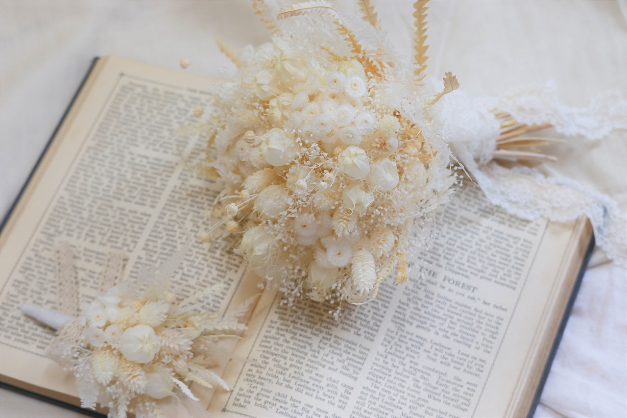 ●ウェディングブーケナチュラルなクラッチタイプのブーケ・ブートニアのセットです。